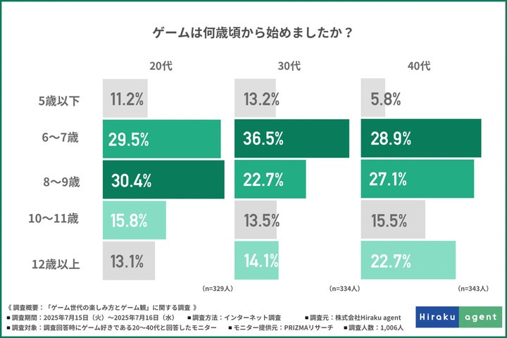 ゲームを始めた年齢は20代が8~9歳、30代と40代は6~7歳が最多。