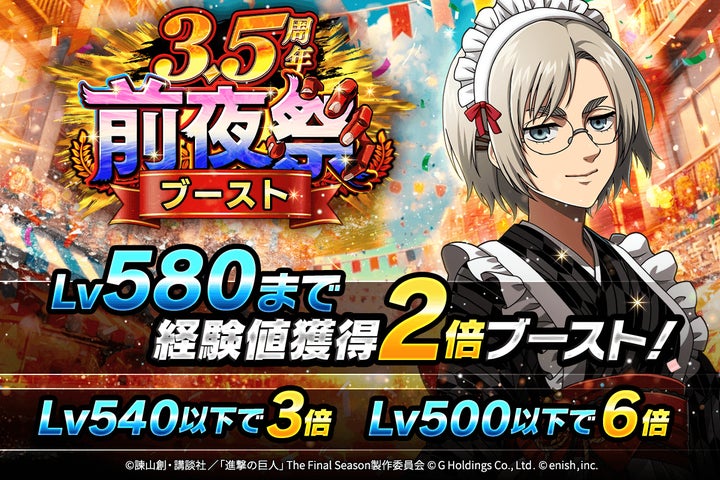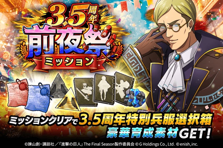 株式会社enishは、スマホゲーム「進撃の巨人Brave Order」にて、2025年7月31日よりブレオダ3.5周年前夜祭を開催する。