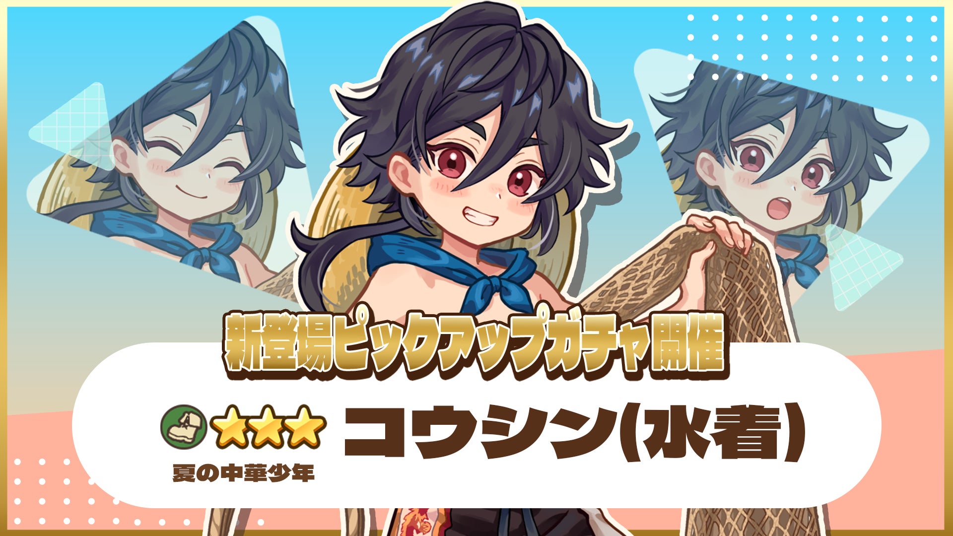 スマートフォンゲーム『異世界キッチン 行列のできる現代料理のお店』にて、★3コウシン(水着)が登場し、出現確率がアップする新登場ピックアップガチャが開催されます。