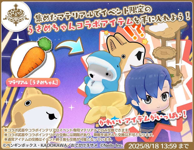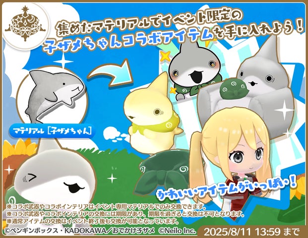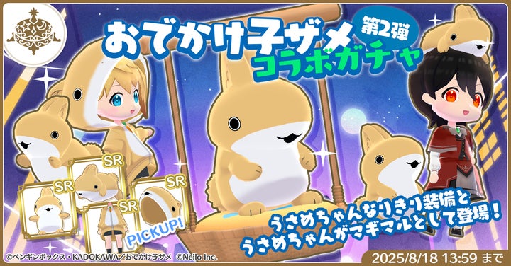 • コラボ期間中は、子ザメちゃん、うさめちゃんになりきれる装備や限定アイテムを入手可能。