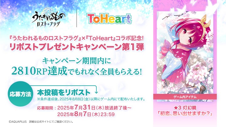 スマートフォン用RPG『うたわれるもの ロストフラグ』にて、『ToHeart』とのコラボイベント「紙牌遊戯 -Secrets of LEAF FIGHT-」が2025年8月1日より開催されます。