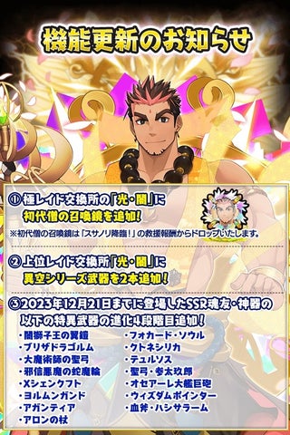 - 光属性の新レイドボス「スサノリ」が登場し、専用ドロップを集めて新魂友を獲得できる。