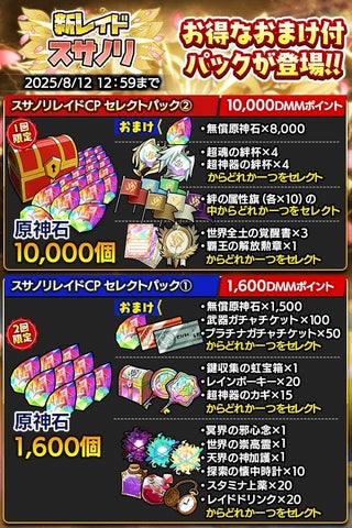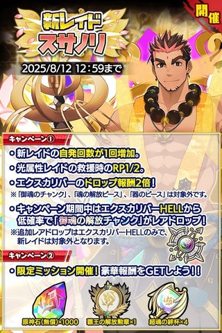 光属性の新レイドボス「スサノリ」が登場し、専用ドロップを集めて新魂友「スサノリ」を仲間にできる。