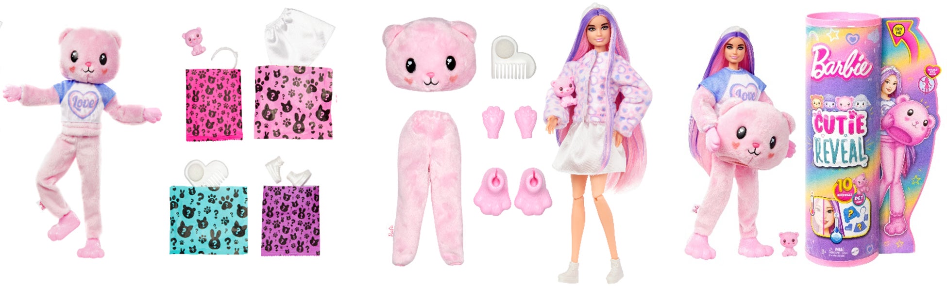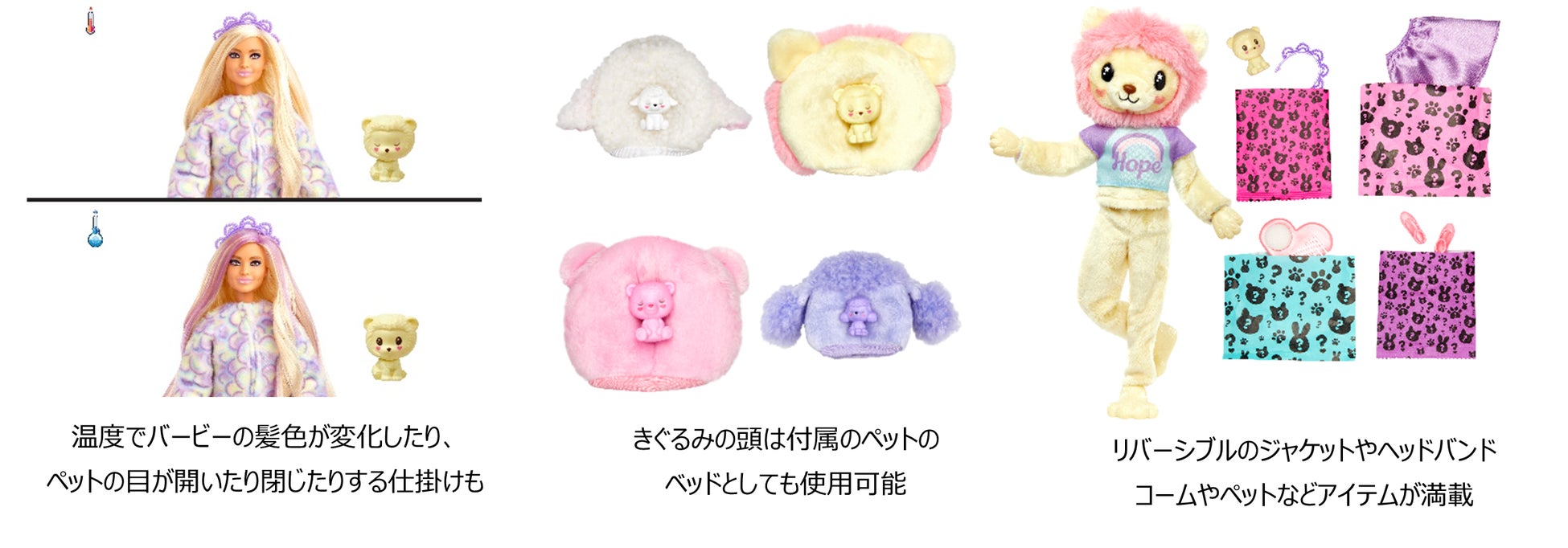 このシリーズでは、バービーが可愛らしい動物の着ぐるみを着ており、リバーシブルのジャケットや着せ替え遊びが楽しめます。