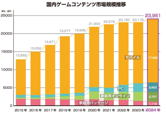 2024年の世界ゲームコンテンツ市場は31兆42億円(前年比5.0%増)、国内ゲームコンテンツ市場は2兆3961億円(同3.4%増)。