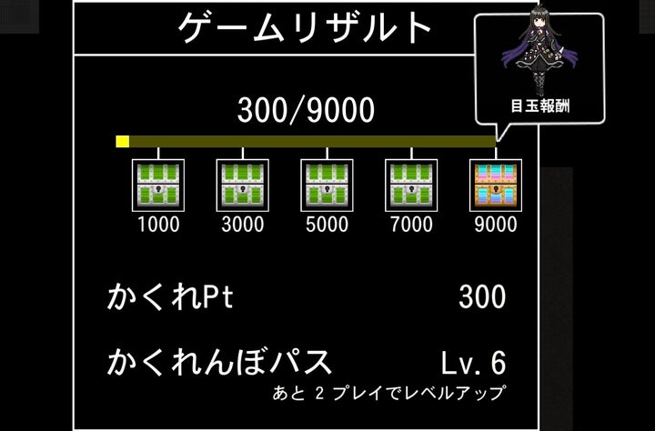 ゲームの結果に応じて「かくれPt」を獲得し、豪華報酬が手に入る「かくれんぼ宝箱」を入手できる。