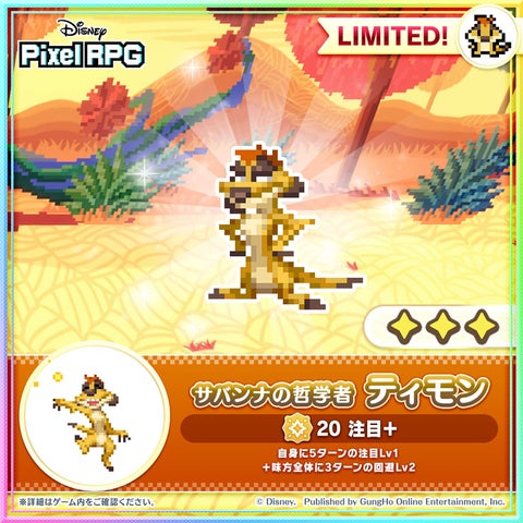 - 期間限定ガチャに「プライドランドの王子 シンバ」と「サバンナの哲学者 ティモン」が登場。