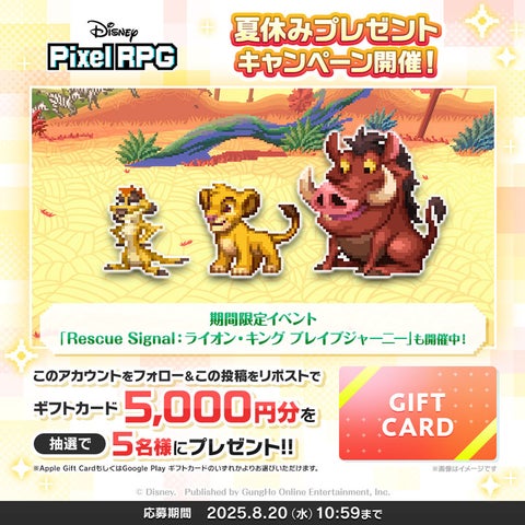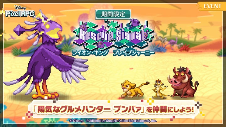 ガンホー・オンライン・エンターテイメントは、スマホゲーム『ディズニー ピクセルRPG』にて、『ライオン・キング』との期間限定イベントを開催します。