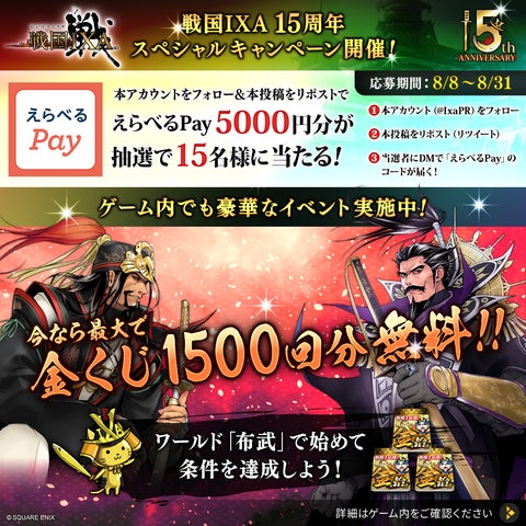 • 『戦国IXA』15周年記念で、最大1,500連分の「金くじ」が無料。