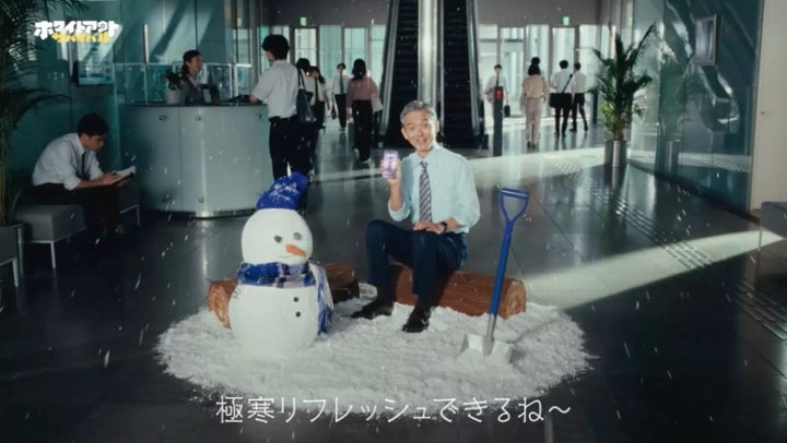 渡部篤郎さんと吉川愛さんが出演し、真夏のオフィスを舞台に、極寒の世界でゲームを楽しむ様子を描いています。