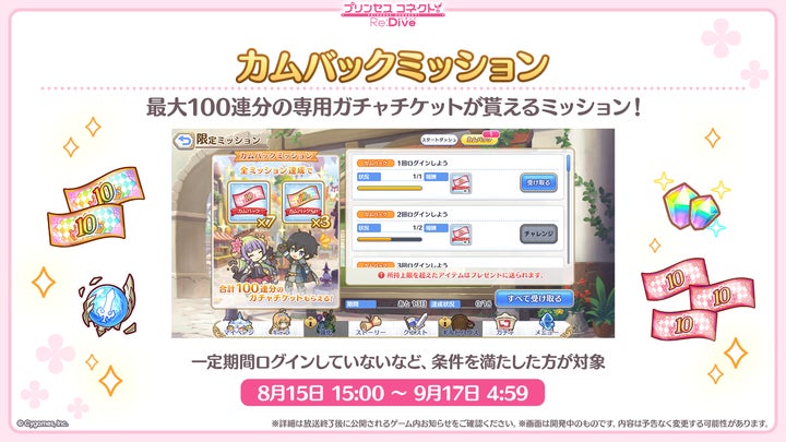 - カムバックプレイヤー向けに「カムバックミッション」を開催し、最大100連分のガチャチケットを配布。