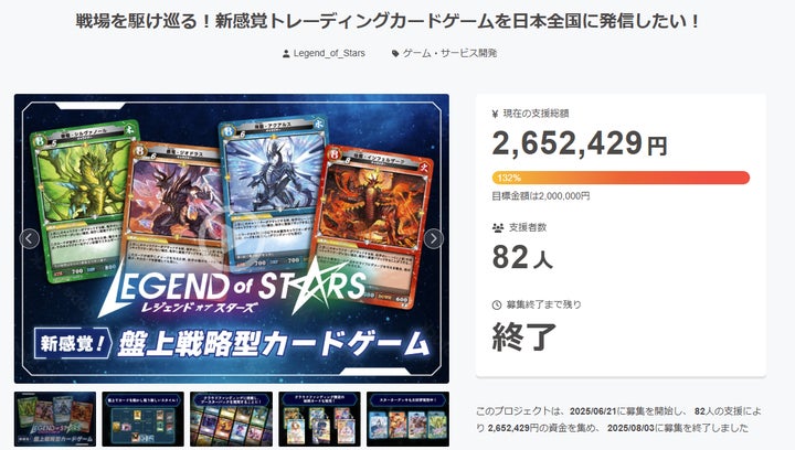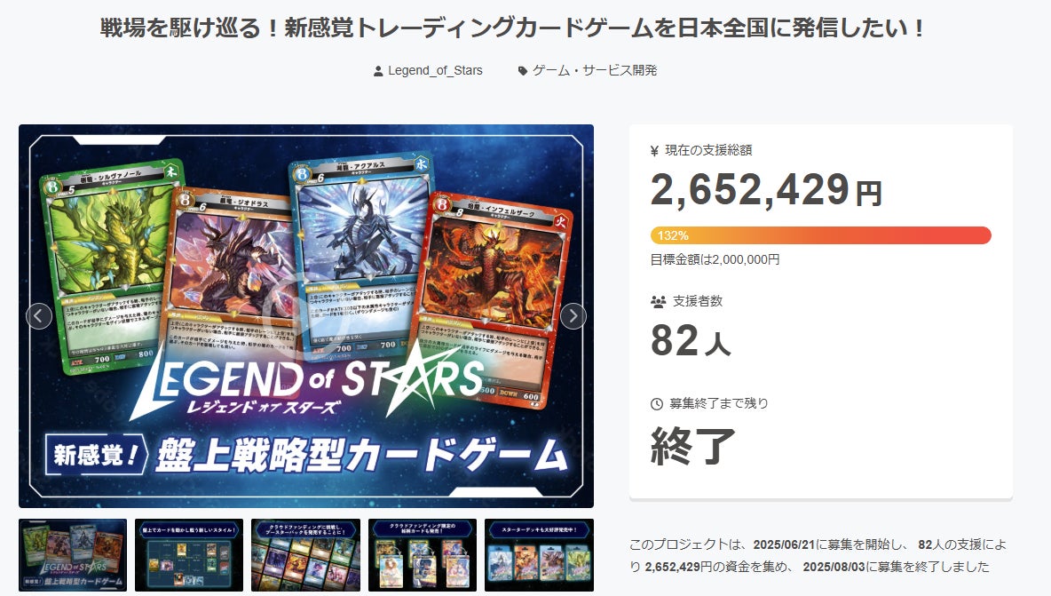 個人制作のトレーディングカードゲーム『レジェンド・オブ・スターズ』が、クラウドファンディングサイト「CAMPFIRE」で目標金額200万円を大きく上回る260万円を達成し、ブースターパックの製造が決定した。