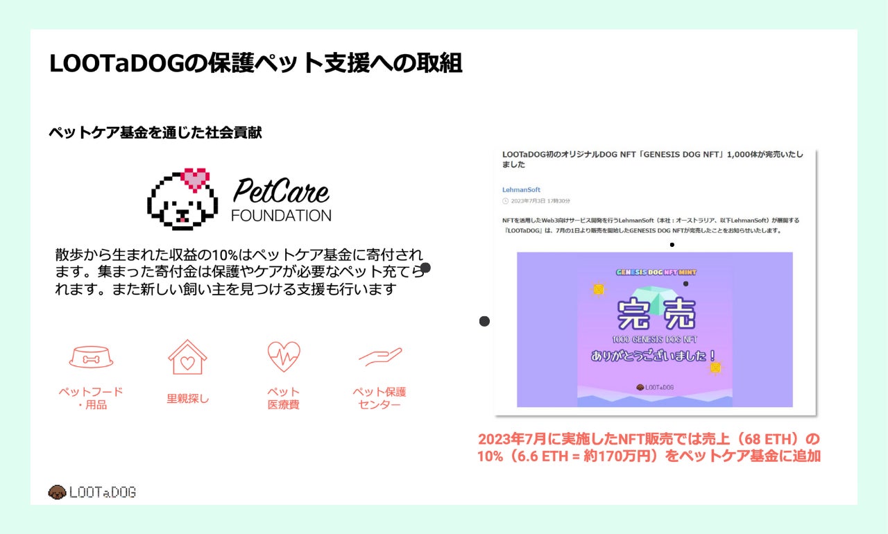 また、ウォレットの作成とNFTの販売から得られた収益を使って、国内外のペットケア団体に寄付を行う予定です。
