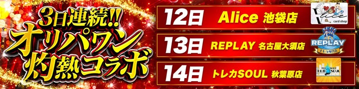 コラボガチャは、8月12日(火)にAlice池袋、8月13日(水)にREPLAY名古屋大須、8月14日(木)にトレカsoul秋葉原とのコラボを実施。