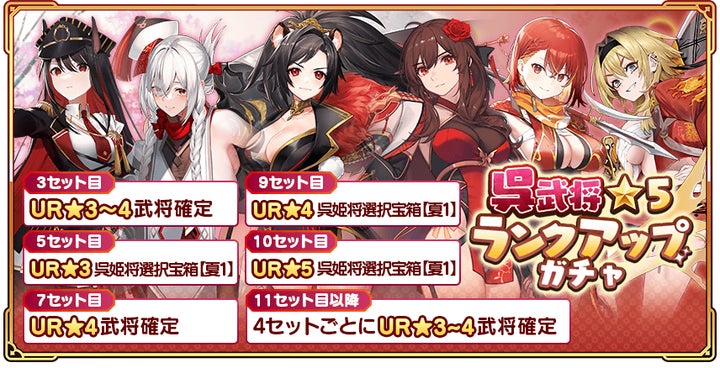 さらに、呉武将★5ランクアップガチャ、季節限定幻想ガチャ、百連祭、UR降臨クエスト挑戦回数2倍、オート再戦数アップなど、様々なイベントが開催される。