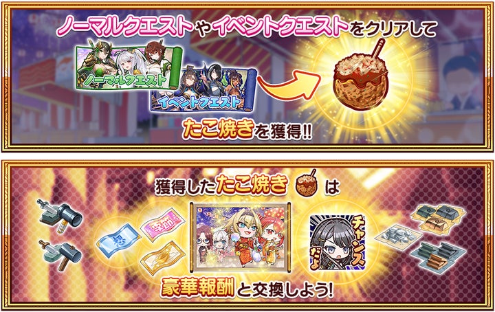 豪華ログインボーナスや、たこ焼きを集めて報酬を得るドロップイベントなどを実施する。
