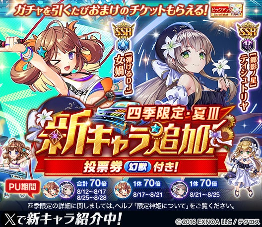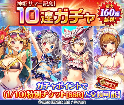 • 最大160連無料の「神姫サマー記念!10連ガチャ」を開催。