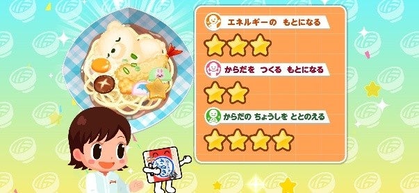 - 新ゲームはアレンジうどんのレシピを通じて、食材の栄養素を学べる内容。