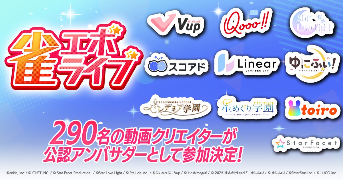 - 新感覚麻雀ゲーム『雀エボライブ』に290名の動画クリエイターが公認アンバサダーとして参加。