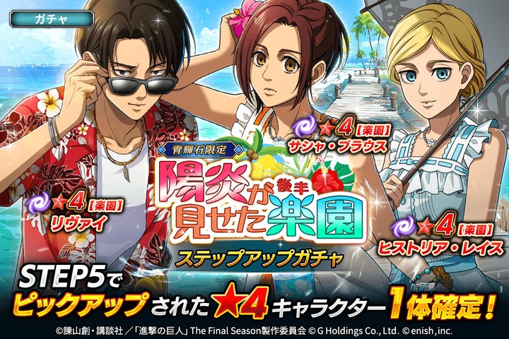 新登場のキャラクターとして、【楽園】リヴァイ、【楽園】サシャ・ブラウス、【楽園】ヒストリア・レイスが登場するガチャも開催される。