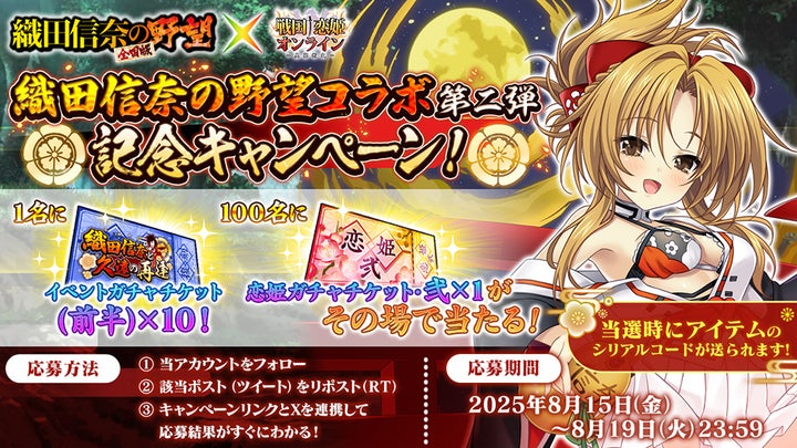 - 限定ガチャで★5織田信奈と★5竹中半兵衛が登場、公式Xでキャンペーンも実施。