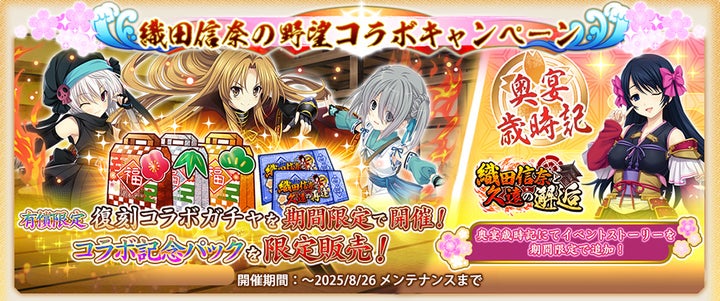 - 『戦国†恋姫オンライン ~奥宴新史~』と『織田信奈の野望 全国版』のコラボ第2弾が開催。
