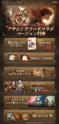 コラボキャラとして『アサシンクリード』からエツィオ、カサンドラ、アレクシオスが登場。