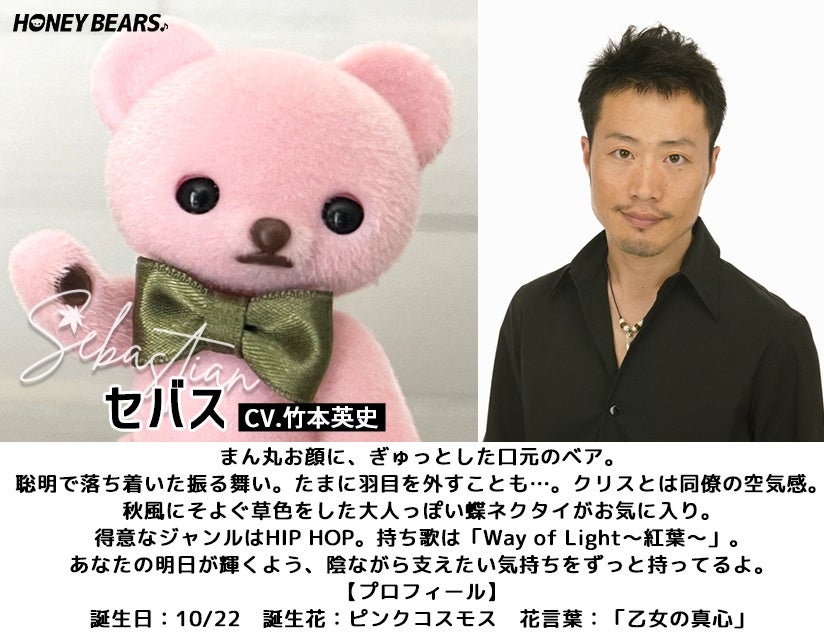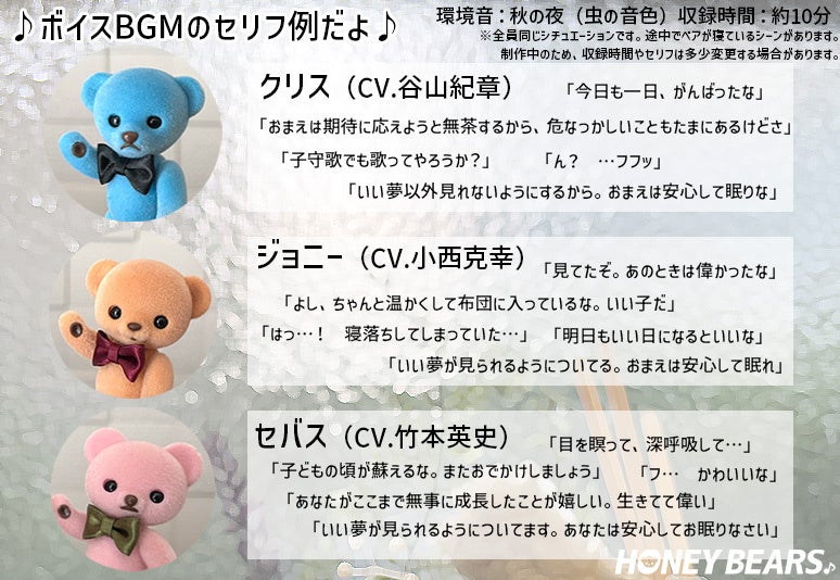 ハニーベアは可愛らしいフロッキードールで、クールな青のベア・クリス役を谷山紀章、元気なベージュのベア・ジョニー役を小西克幸、聡明なピンクのベア・セバス役を竹本英史が演じます。