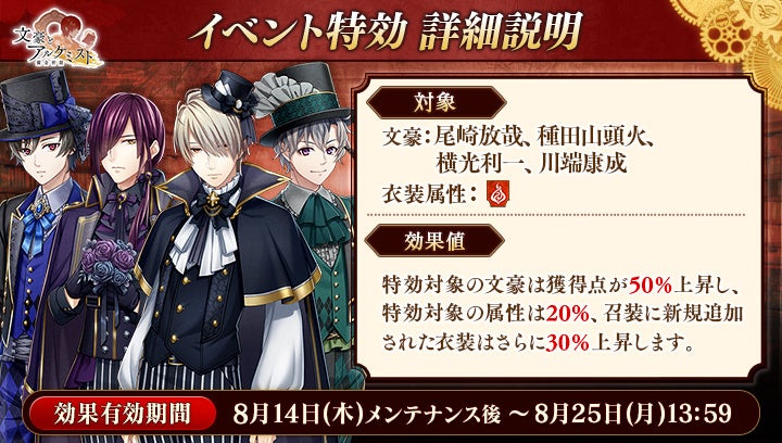 期間中は、特定の文豪の衣装を編成すると得点アップ。