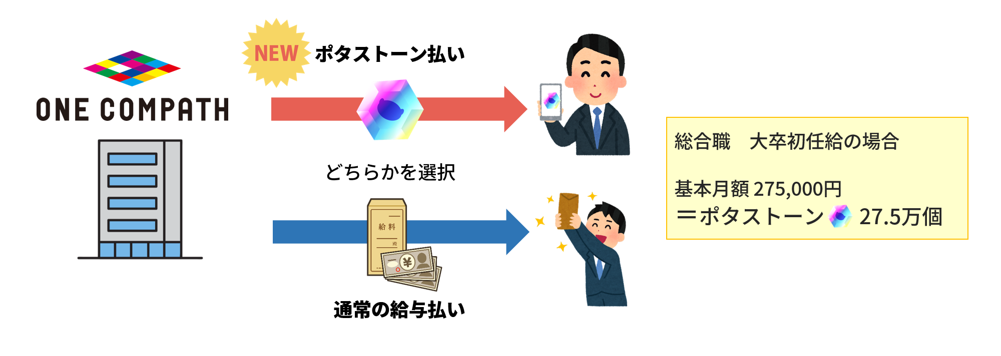 当社に勤務する正社員は通常の給与払いに加え、当該給与相当分のポタストーンを支払う「ポタストーン払い」を選択することができます。なお、ポタストーンは1個あたり1円換算で配布されます。