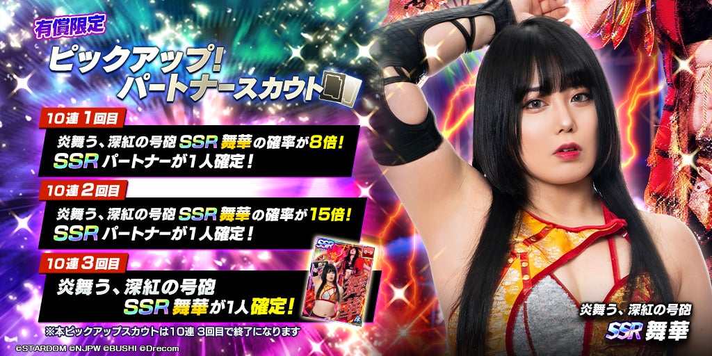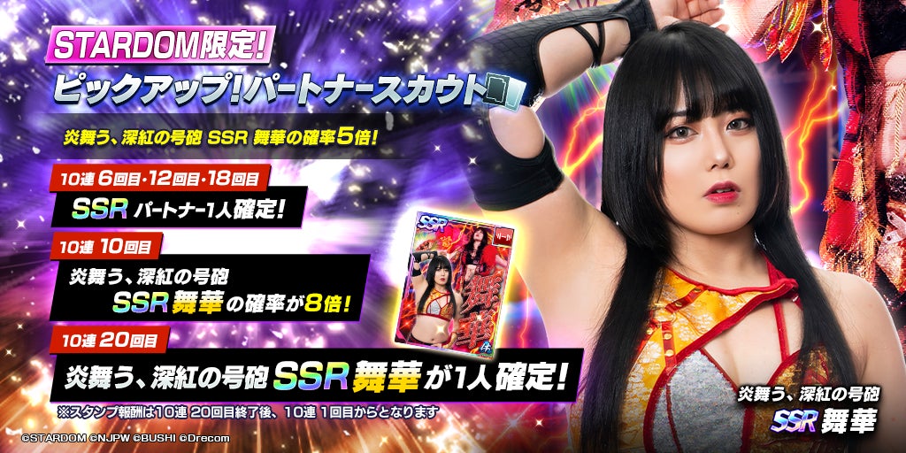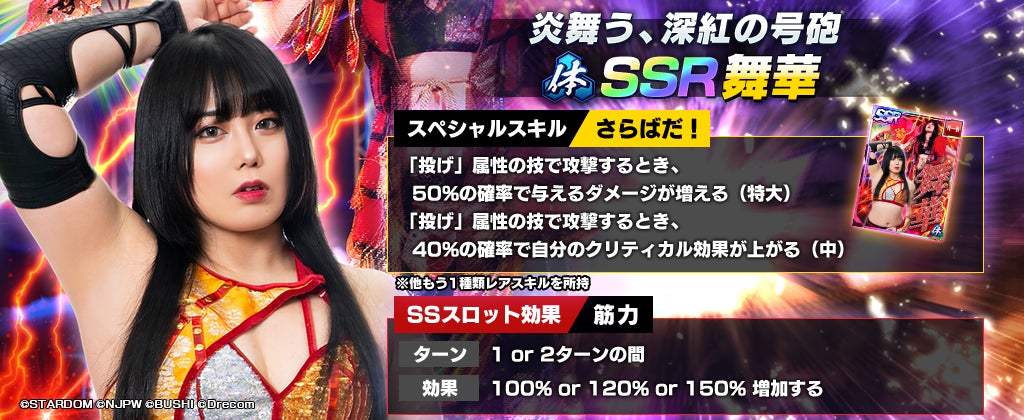 株式会社ブシロードと株式会社ドリコムが共同開発したスマートフォンゲームアプリ『新日本プロレスSTRONG SPIRITS』(以下、新日SS)に、STARDOMからSSR「[炎舞う、深紅の号砲]舞華」が新たなパートナーカードとして追加されました。