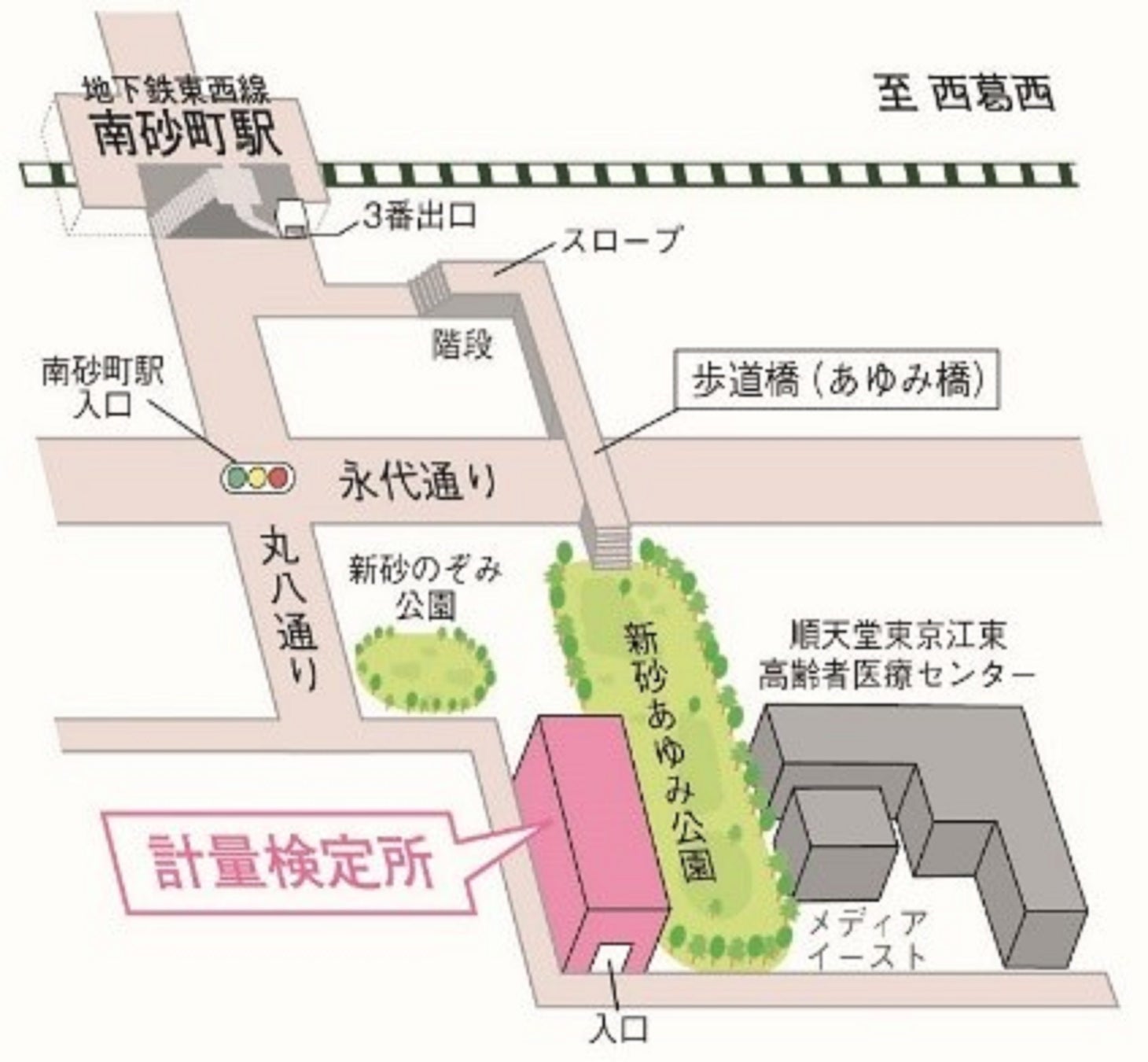 場所は東京都計量検定所(江東区新砂3-3-41)で、地下鉄東西線南砂町駅3番出口から徒歩約5分です。