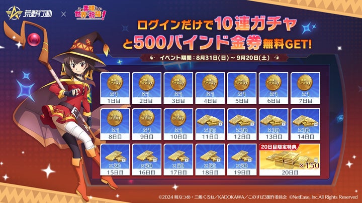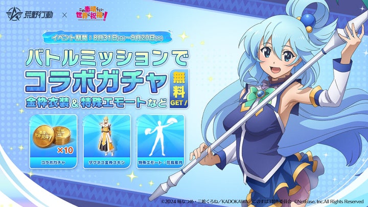 2025年8月31日から9月20日まで、アクア、めぐみんなどの限定スキンやアイテムが登場する。