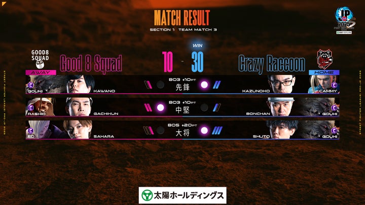 - TEAM MATCH 1ではまちゃぼー選手が勝利、TEAM MATCH 2では高木選手が延長戦を制す。