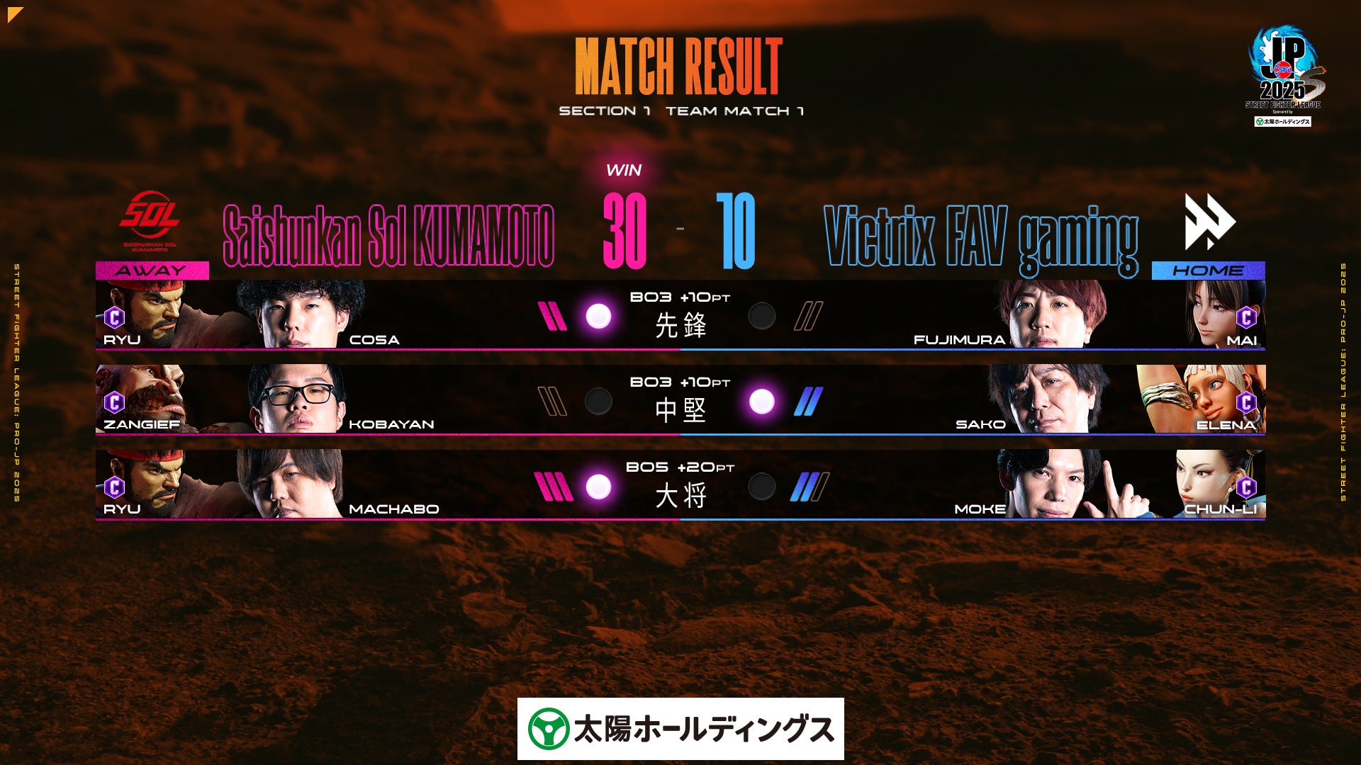 - 「ストリートファイターリーグ: Pro-JP 2025 Division S 第1節」の結果速報。