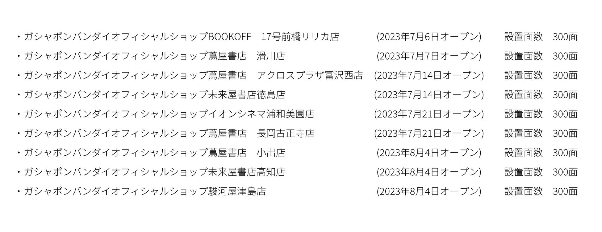 - 2023年8月4日に高知県高知市の未来屋書店内に「ガシャポンバンダイオフィシャルショップ」をオープン