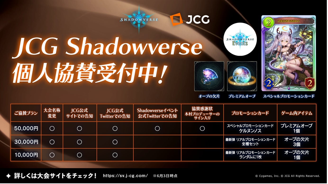 その中でも、「JCG Shadowverse Open」という大会では、個人協賛総額が100万円を突破しました(6月3日時点)。