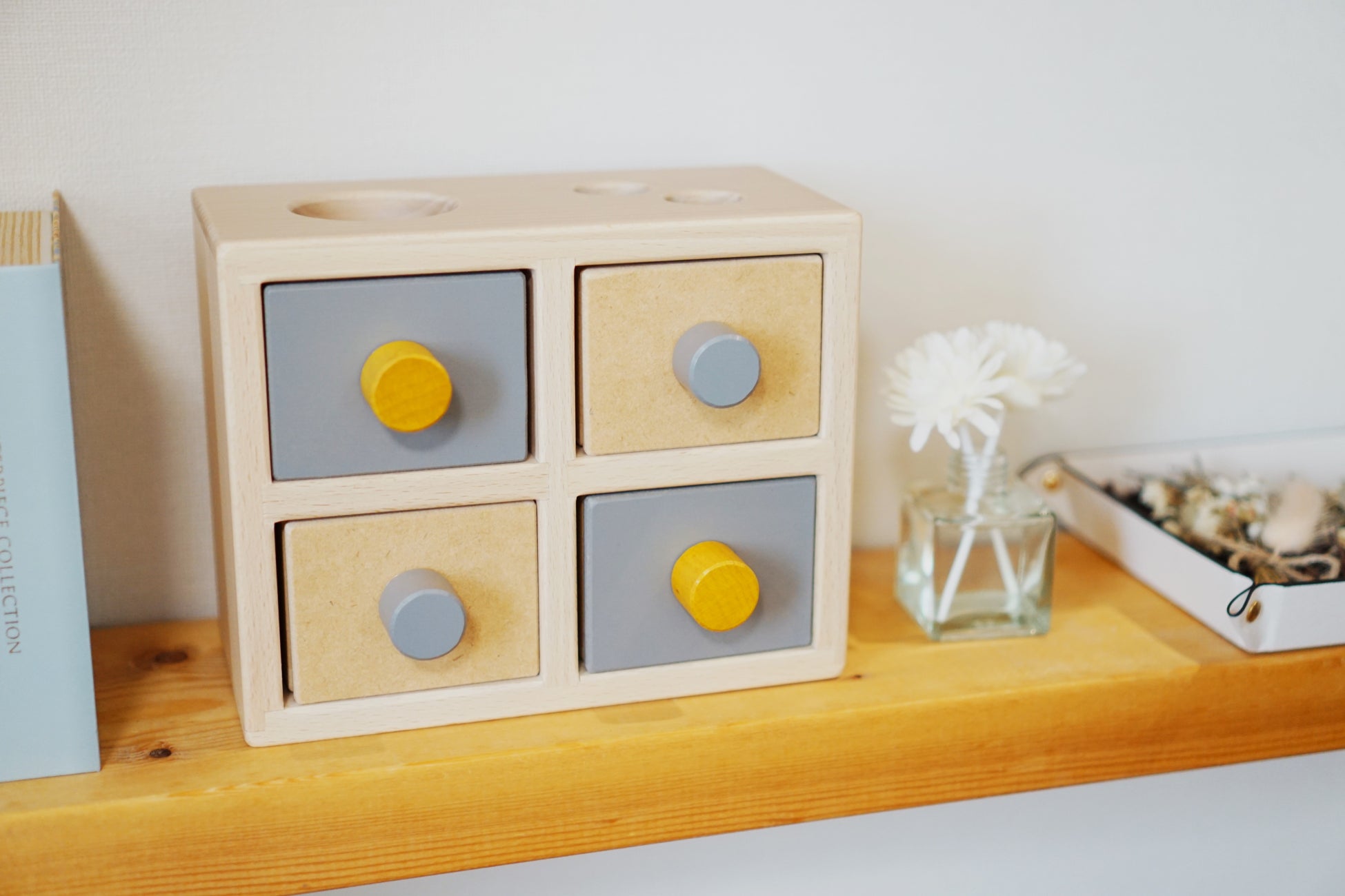 このおもちゃは、1歳0か月から遊ぶことができる知育玩具で、インテリアのようなデザインと創造力を育む仕掛けが特徴です。