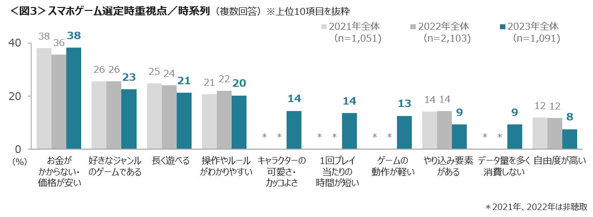 ゲームを選ぶ際の主な理由は、「お金がかからない・価格が安い」ことが最も重視されています。