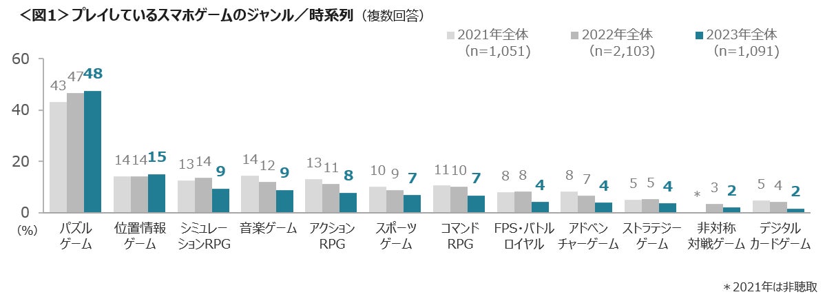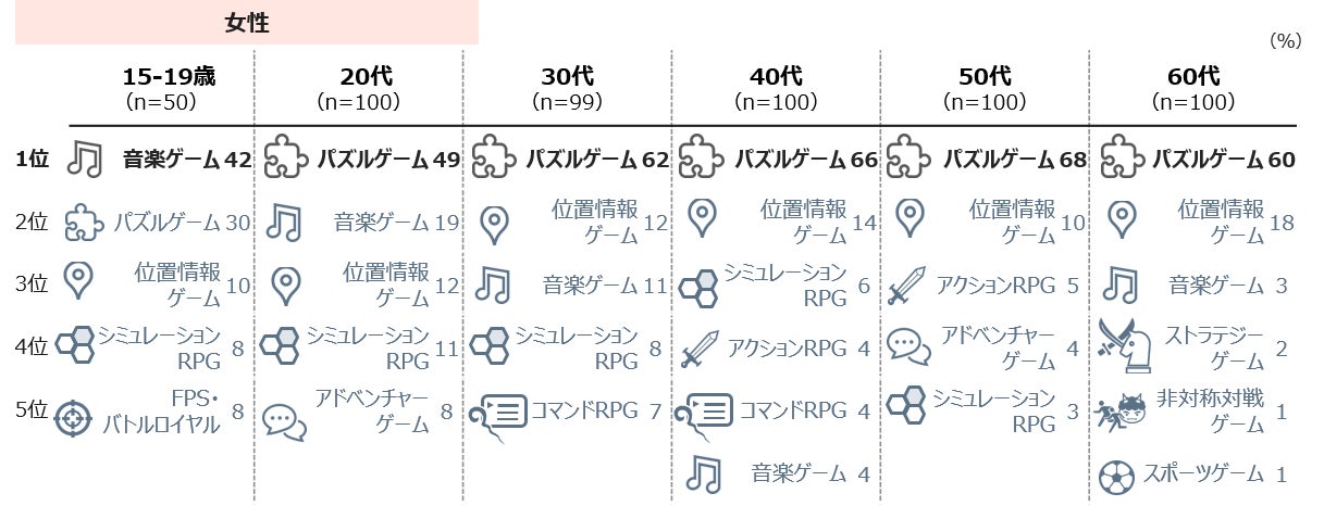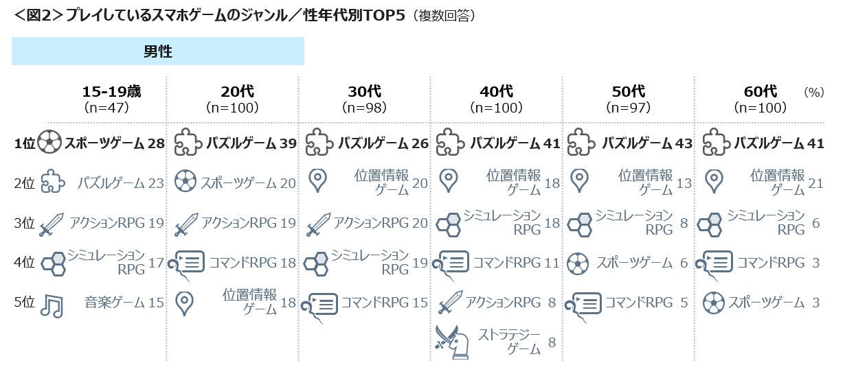 調査結果から、最もプレイされているジャンルは「パズルゲーム」であり、特に20代以上の男女や女性30代~60代に人気があります。