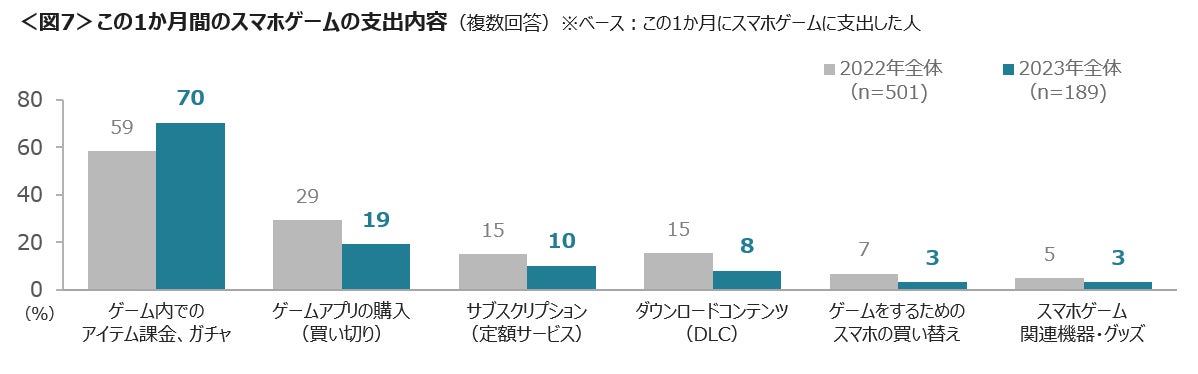 また、直近1か月間にスマホゲームにお金を使った人は17%で、支出内容は「ゲーム内でのアイテム課金やガチャ」が最も多く、次いで「ゲームアプリの購入(買い切り)」や「サブスクリプション(定額サービス)」も支出されています。
