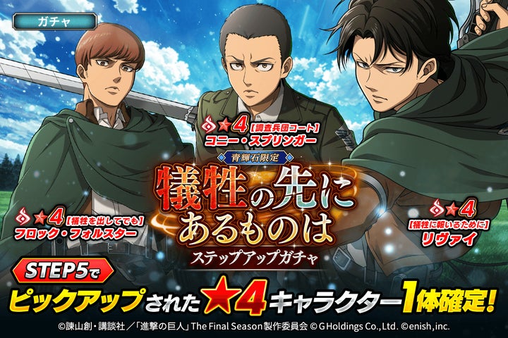 イベントに合わせて、【犠牲に報いるために】リヴァイ、【調査兵団コート】コニー・スプリンガー、【犠牲を出してでも】フロック・フォルスターが登場するガチャも開催。