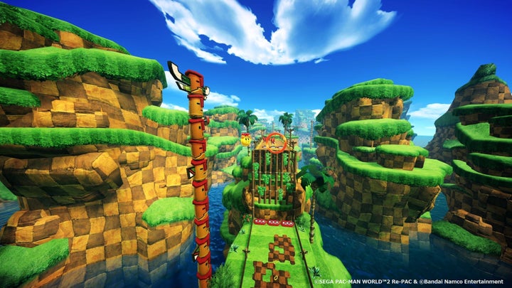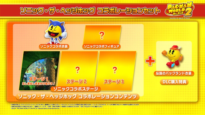 新ステージ「ふしぎなしまをかけぬけろ!」では、ソニックの象徴的なステージ「グリーンヒルゾーン」をモチーフにしたコースが登場し、パックマンがソニックの衣装を身につけてプレイすることも可能です。