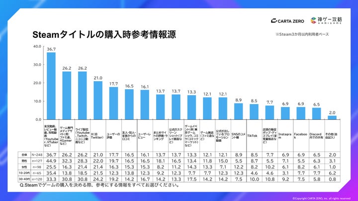 購入時に参考にする情報源は「実況・レビュー動画」が最も多く、次いで「ゲーム専門メディアサイト」「ライブ配信」が上位に。