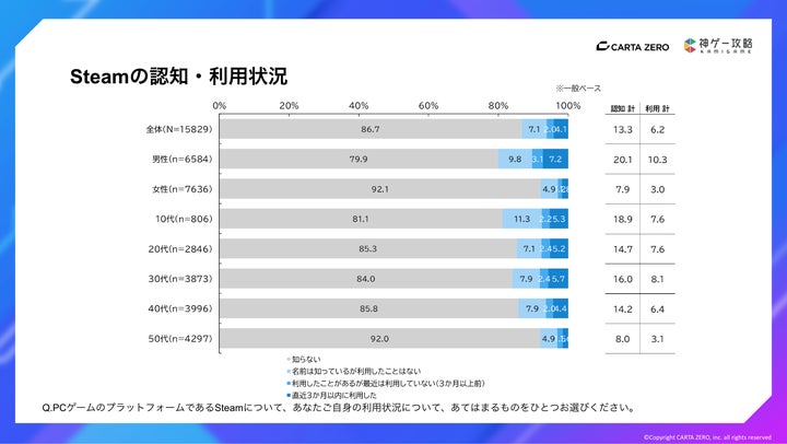 - Steamの一般層における認知率は13.3%、利用経験率は6.2%。