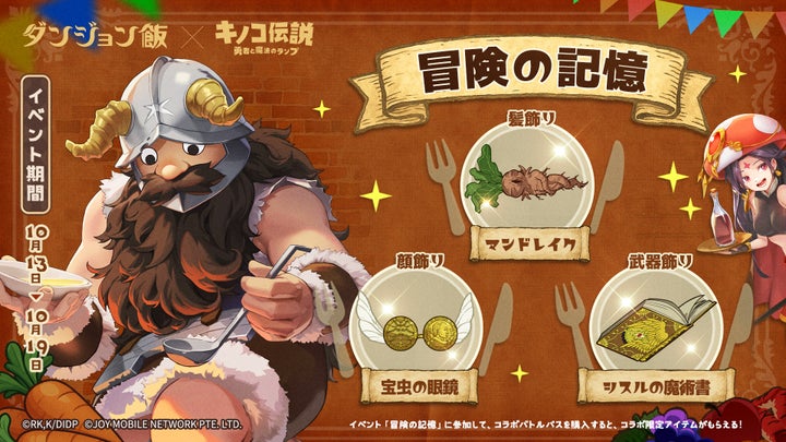 - 『キノコ伝説:勇者と魔法のランプ』と『ダンジョン飯』のコラボが開催。