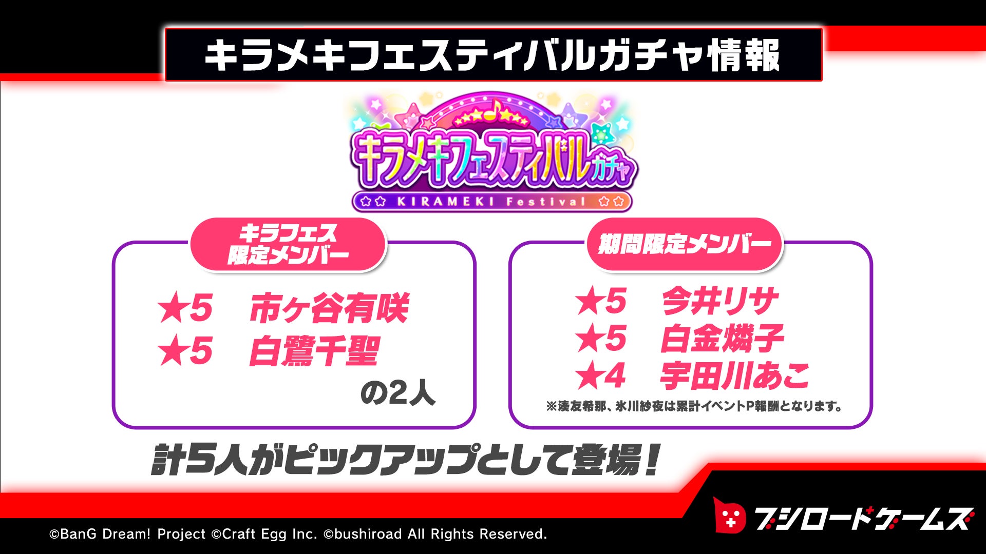 この期間中、「キラメキフェスティバルガチャ」が行われ、市ヶ谷有咲と白鷺千聖という新たなキラフェス限定メンバーが登場します。