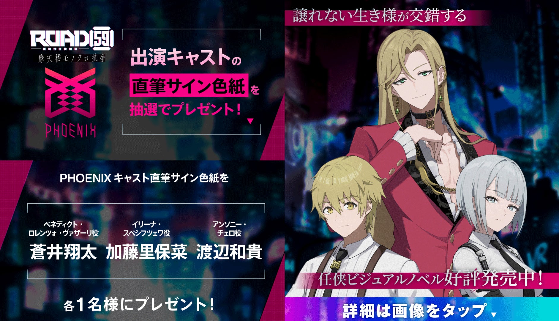 ブシロードより発売されるビジュアルノベルゲーム「ROAD59 -新時代任侠特区- 摩天楼モノクロ抗争」の発売を記念し、出演キャストの直筆サイン色紙が当たるキャンペーンが開催される。