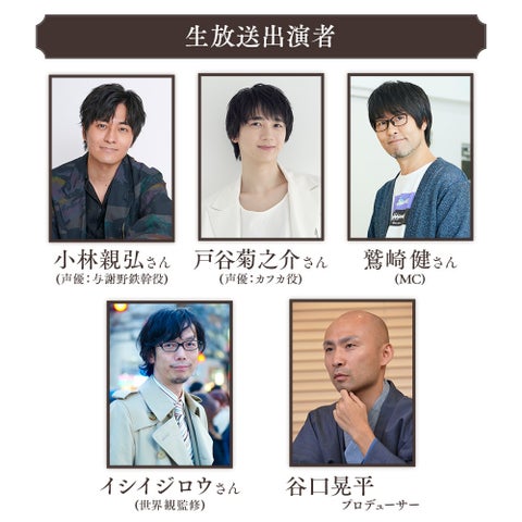 MCは鷲崎健さん、出演はイシイジロウさん(世界観監修)と谷口晃平プロデューサー、ナレーターは大河元気さんです。