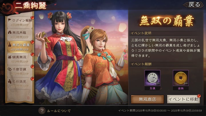 • コラボ武将として「無双大喬」「無双小喬」が登場。